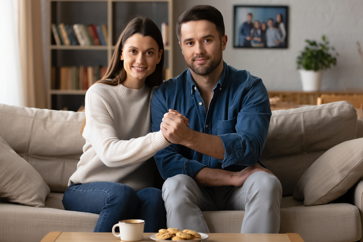 A Young Couple Smiling Together in a Cozy Living R...